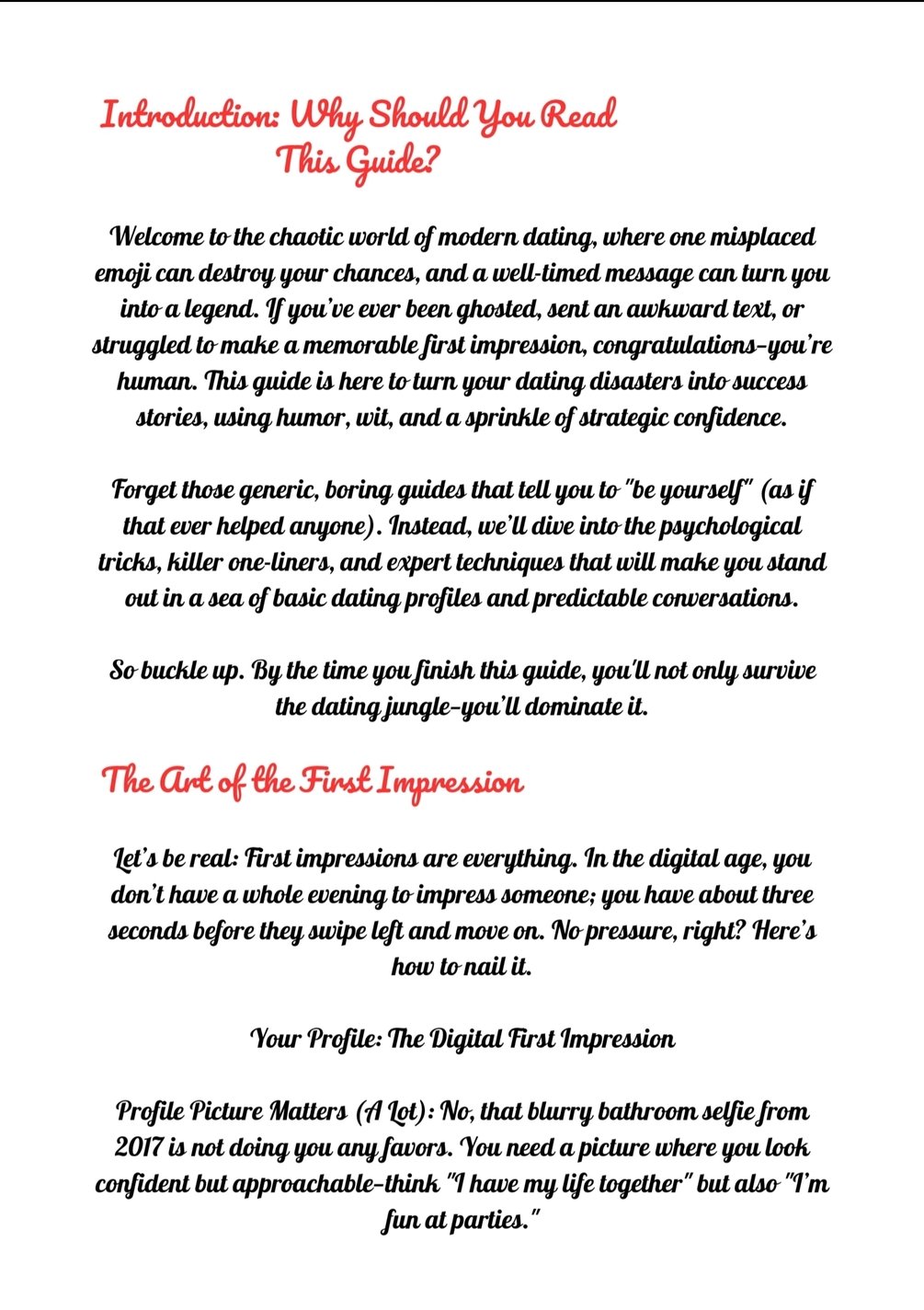 Spanning over 40 pages of expertly curated insights, this guide blends psychology, humor, and practical wisdom to navigate the complexities of modern dating. Whether you’re just stepping into the world of romance or looking to rekindle the spark in a long-term relationship, this book provides the perfect balance between elegance and playfulness.